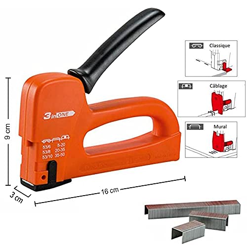 Materiaal: Behuizing van ABS en multifunctioneel eindstuk van nylon, wandnietmachine, nietjes van het type: Rapid/Tacwise #53/#13 van 6 tot 12 mm lengte, Arrow JT21 0,63 en 0,95 cm (1/4 en 3/8 inch), Stanley #A/TRA200 van 6 tot 12 mm lengte, klassiek nietapparaat en voor Bedrading, nietjes van het type: Rapid/Tacwise #53 van 6 tot 12 mm lengte, Arrow JT21 0,63 en 0,95 cm (1/4 en 3/8 inch), Stanley #A/TRA200 van 6 tot 12 mm lengte.