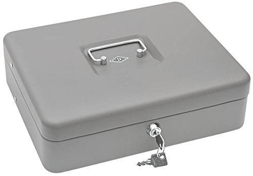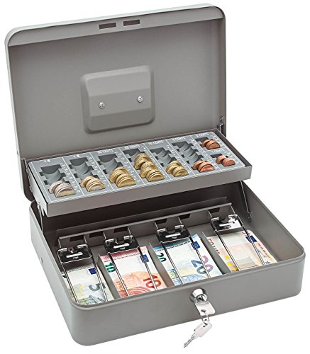 WEDO® geldtelcassette STANDARD PLUS met bankbiljettenbeugels, inhoud 137,60 euro. De geldcassettes voor munten en bankbiljetten zijn gemaakt van stevig, gepoedercoat plaatstaal met een mat, duurzaam oppervlak en voorzien van een draaggreep en een cilinderveiligheidsslot met 2 sleutels. Het inzetstuk voor harde geld glijdt bij het openen van de koffer automatisch naar achteren. Het inzetstuk met 4 vakken voor bankbiljetten is uitgerust met bevestigingsbeugels van metaal. Achter de vakken voor bankbiljetten bevindt zich nog opbergruimte voor muntrollen, documenten e.d. Afmetingen: 30,0 x 24,0 x 9,0 cm, gewicht: ca. 2.240 g, kleur: muntenbak en cassette grijs. Levering in afzonderlijke doos.